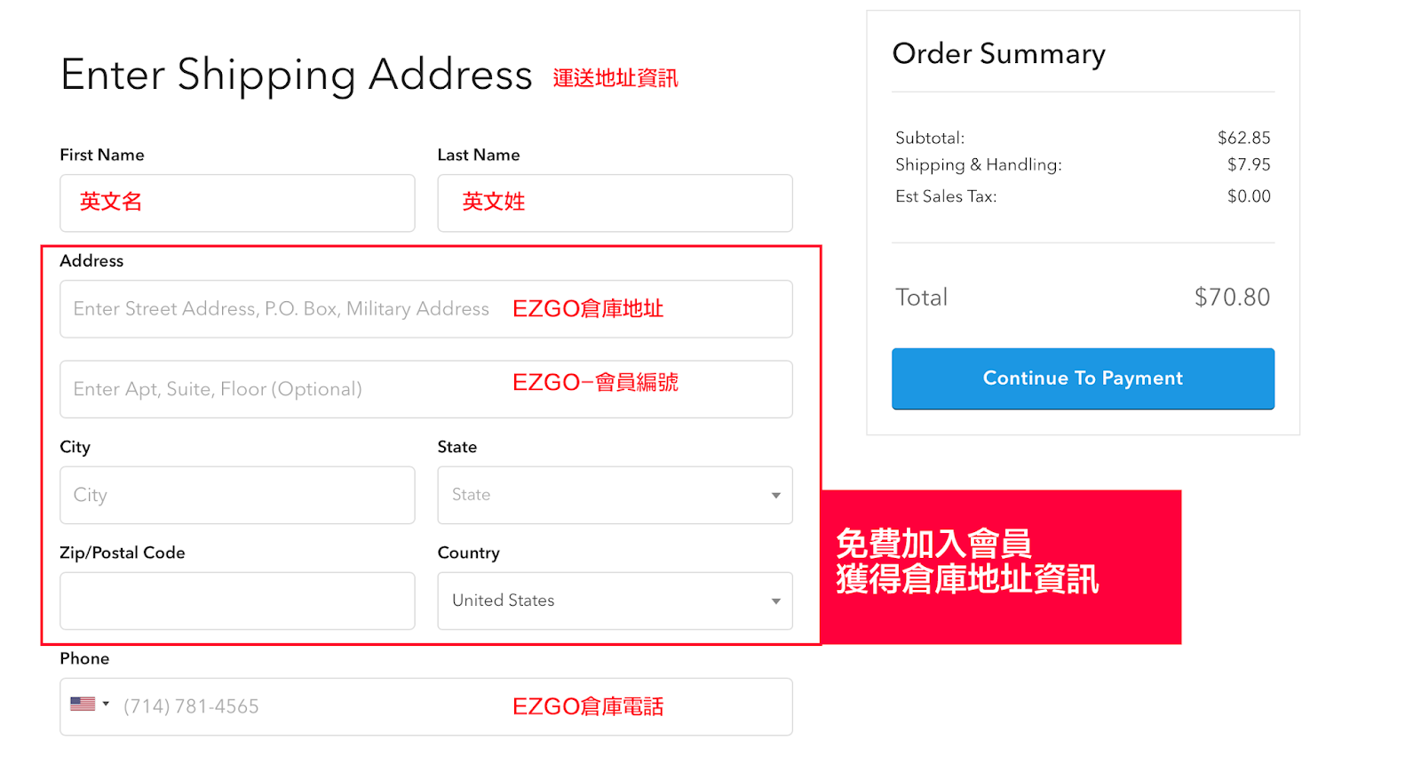 歡迎免費加入EZGO官網會員,索取倉庫地址與會員編號