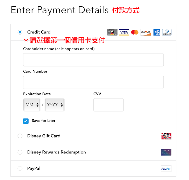 其他付款方式,除非您有他們迪士尼聯名信用卡或是持有美國發卡之信用卡